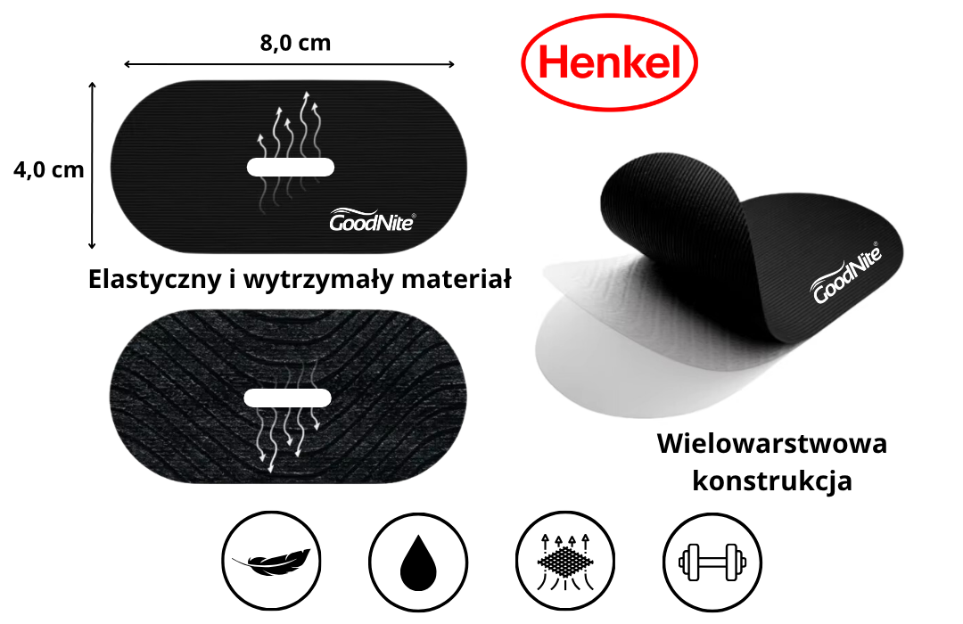 ⭐ UNIKALNA KONSTRUKCJA: Plaster GoodNite zawiera zewnętrzną oddychającą warstwę (95% bawełna i 5% elastyczny spandex), wbudowaną membranę z klejem medycznym Henkel do zastosowań na skórze oraz zabezpieczającą warstwę ochronną.